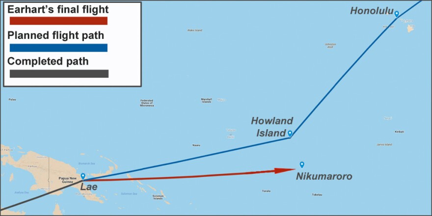 Two competing theories hold that Earhart's plane crashed and sank in the open ocean or that she strayed off course in another direction and landed in the Marshall Islands, then under Japanese control.
