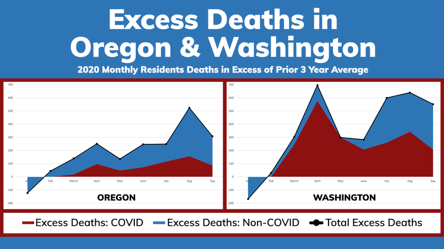 There have been nearly 2,000 deaths above normal this year through October in Oregon, around 3,300 deaths above normal in Washington state and 1,100 in Idaho, according to preliminary data collected by the federal Centers for Disease Control and the Oregon Health Authority. All of these numbers are subject to adjustment based on lagging death certificate filings.